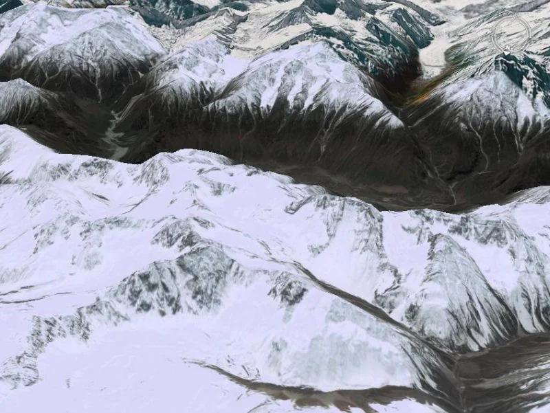 To its north was a high, snow-covered, mountain that could well have been Mount Kulha, where Rinpoche had lived and meditated before the escape. Moving up the valley, following his map and account, there, just to the west was a lake (black in GE's satellite's view, but probably a turquiose blue at ground level), surrounded by five peaks, the Bön tradition's Five Mothers.